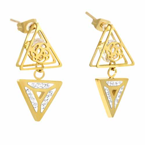 STAINLESS STEEL EARRINGS ALL IN IPG COLOR IN TWO TRIANGLE SHAPES WITH ROSE PATTERN AND CZ