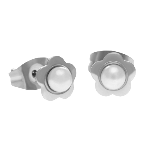 STAINLESS STEEL EARRING IN FLOWER SHAPE WITH ONE SYNTATIC PEARL INTHE CENTER