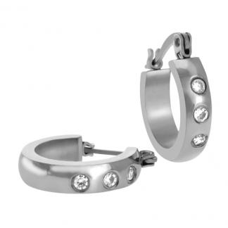 STAINLESS STEEL HOOPS EARRINGS IN CIRCLE SHAPE ALL IN S/S COLOR WITH THREE STONES OF CRYSTAL.