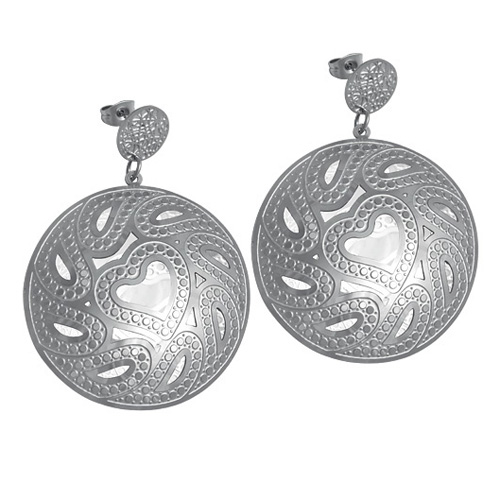 STAINLESS STEEL 3D EARRING IN CIRCLE SHAPE WITH HEART PATTERN WITH CUT OUTALL IN STEEL COLOR
