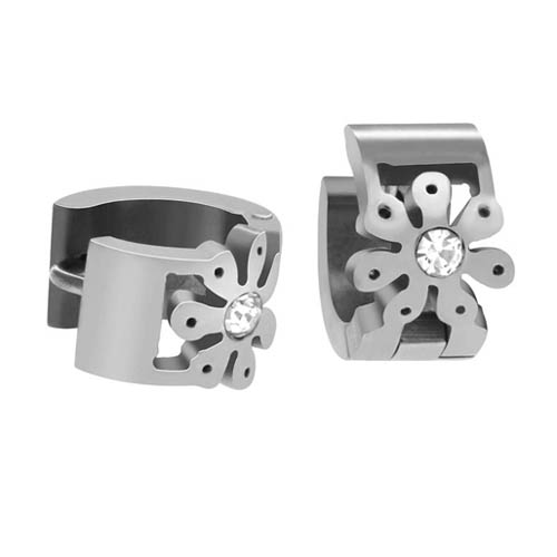 STAINLESS STEEL HUGGIE EARRINGS ALL IN S/S COLOR WITH FLOWER SHAPE WITH CZ