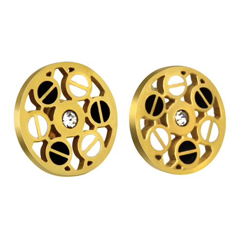 STAINLESS STEEL EARRINGS IN CIRCLE SHAPE WITH A CRYSTAL IN CENTER AND BLACK & WHITE SCREW PATTERN ALL IN IPG COLOR.