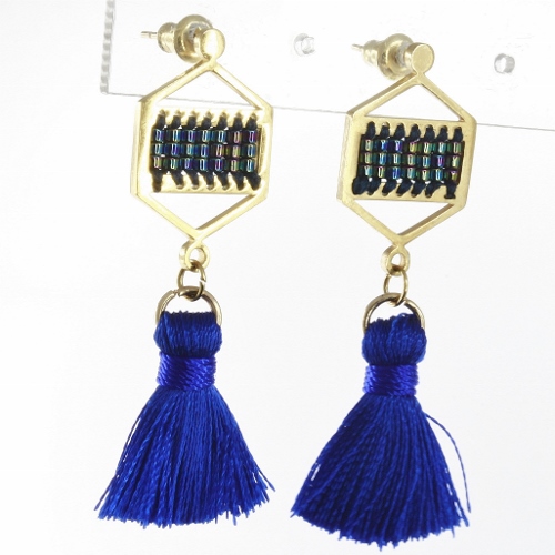 STAINLESS STEEL EARRING WITH BEADS AND COTTON TASSEL. IN IPG COLOR