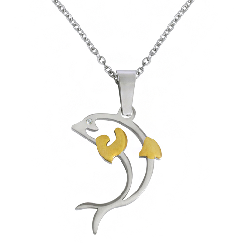 STAINLESS STEEL NECKLACE WITH DOLPHIN PENDANT IN IPG TWO TONE WITH CZ