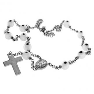STAINLESS STEEL ROSARY NECKLACE WITH S/S COLOR NECKLACE WITH WHITE BEADS WITH CROSS PENDANT WITH OVAL PENDANT IN S/S COLOR |
