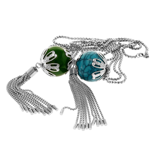STAINLESS STEEL NECKLACE WITH PENDANT BALL IN TURQUOISE AND GREEN WITH THIN CHAIN IN CASCADE AND TASSEL ALL IN S/S COLOR