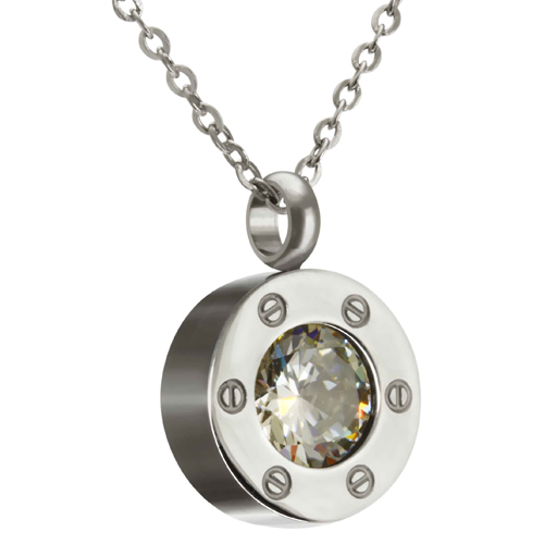 STAINLESS STEEL NECKLACE WITH CIRCLE PENDANT WITH CZ AND ROMAN NUMBERS IN S/S COLOR.