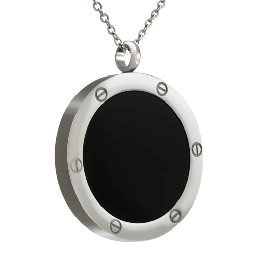 STAINLESS STEEL NECKLACE WITH CIRCLE PENDANT WITH SCREW PATTERN AND BLACK ENAMEL IN S/S COLOR