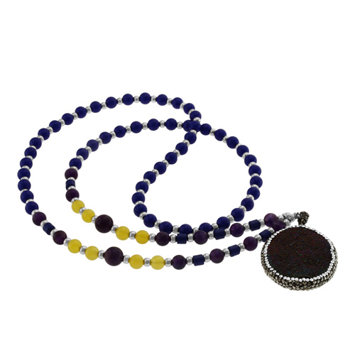 STAINLESS STEEL NECKLACE IN DARK BLUE AND YELLOW WITH A STONE BROWN AND CRYSTAL BLACK AND WHITE.