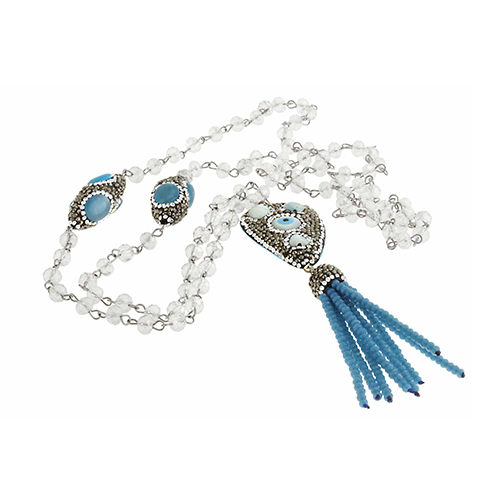 | STAINLESS STEEL NECKLACE WITH WHITE CRYSTAL AND TURQUUOISE STONE/PENDANT WITH LARIMAR STONE WITH TASSEL IN BLUE CRYSTAL |