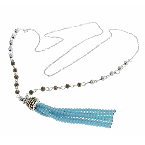 STAINLESS STEEL NECKLACE WITH BLUE TASSEL AND GUN COLOR CRYSTALS