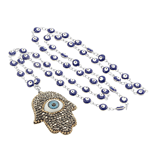 STAINLESS STEEL HAMSA PENDANT WITH EYE CHAIN.
