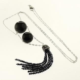 STAINLESS STEEL NECKLACE WITH 2 OBSIDIAN STONE AND ONE CRYSTAL TASSEL.