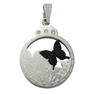 STAINLESS STEEL PENDANT In circle shape with Rose & butterfly with 3cz In IPB two tone