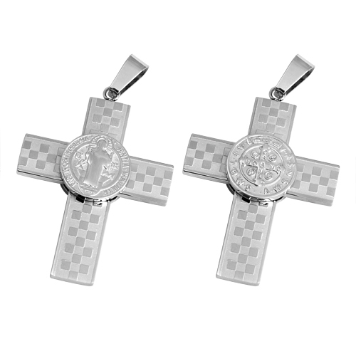 STAINLESS STEEL PENDANT IN CROSS SHAPE WITH CHECKER PATTERN WITH SAN BENITO BOTH SIDE ARE DIFFERENCE ALL IN S/S COLOR