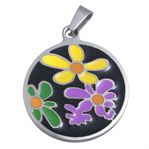 STAINLESS STEEL PENDANT IN CIRCLE SHAPE WITH BLACK AND COLORFUL FLOWER