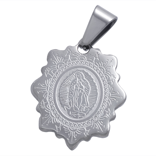STAINLESS STEEL PENDANT WITH RELIGIOUS FIGURE GUADALUPE WITH WAVY EDGE ALL IN STEEL COLOR