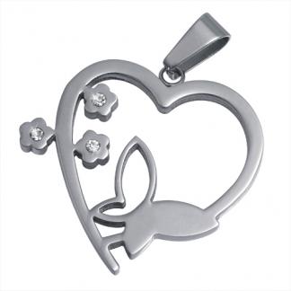STAINLESS STEEL PENDANT IN HEART SHAPE WITH BUTTERFLY & FLOWER WITH 3 CZ ALL IN STEEL COLOR