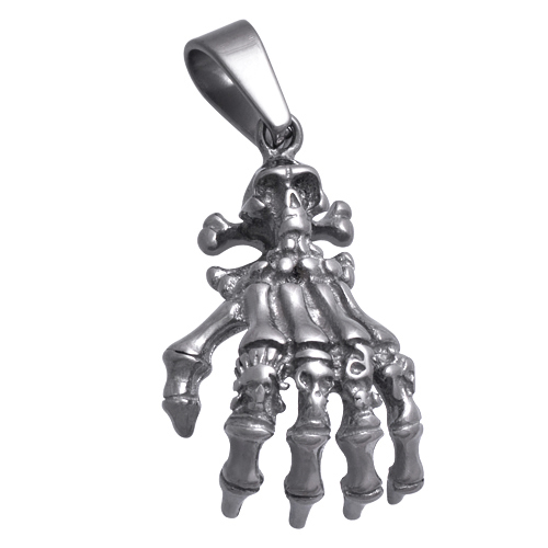 STAINLESS STEEL PENDANT IN SKELETON HAND SHAPE WITH SKULL ALL IN STEEL COLOR
