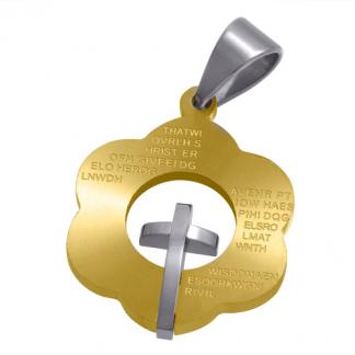 STAINLESS STEEL RELIGIOUS PENDANT FLOWER SHAPE LASER EFFECT WITH BIBLE VERSE & CROSS IPG 2 TONE