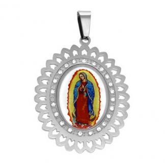 STAINLESS STEEL PENDANT ALL IN S/S COLOR IN OVAL SHAPE WITH FLOWER EDGE WITH CZWITH GUADALUPE IN COLORFUL IMAGE