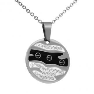 STAINLESS STEEL PENDANT IN MEDALSHAPE WITH A SCREW DESIGN IN BLACK & WHITE WITH CRYSTAL ALL IN S/S COLOR.