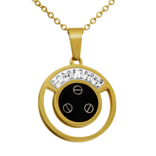 STAINLESS STEEL PENDANT CIRCLE SHAPE WITH CRYSTAL AND A SCREW PATTERN IN A BLACK ENAMEL ALL IN IPG COLOR