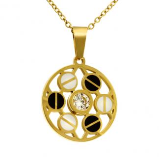 STAINLESS STEEL PENDANT IN CIRCLE SHAPE WITH A CRYSTAL IN CENTER AND BLACK & WHITE SCREW PATTERN ALL IN IPG COLOR.