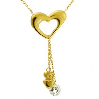 STAINLESS STEEL NECKLACE ALL IN IPG COLOR WITH HOLLOW HEART CHARMS AND TWO HANGING HEART AND CRYSTAL.
