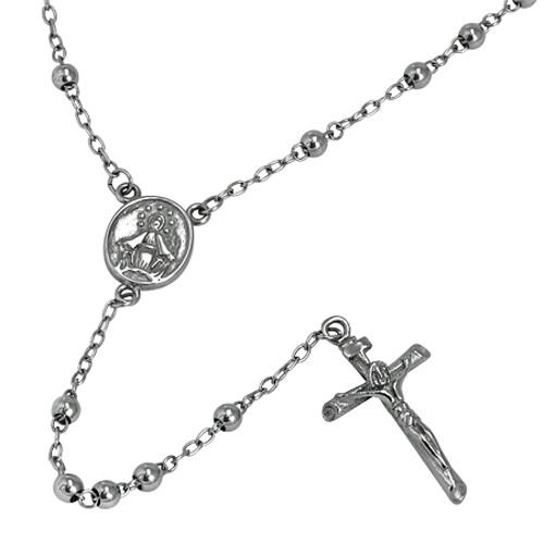Stainless Steel Necklace with Rosary oval pendant and Jesus Cross and beads All in Steel Color