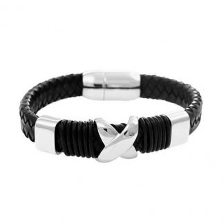 STAINLESS STEEL BRACELET WITH BLACK LEATHER WITH CROSS IN CENTER WITH MAGNET LOCK