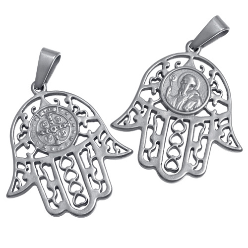 STAINLESS STEEL RELIGIOUS PENDANT IN HAMSA HAND SHAPE WITH SAN BENITO ALL IN STEEL COLOR