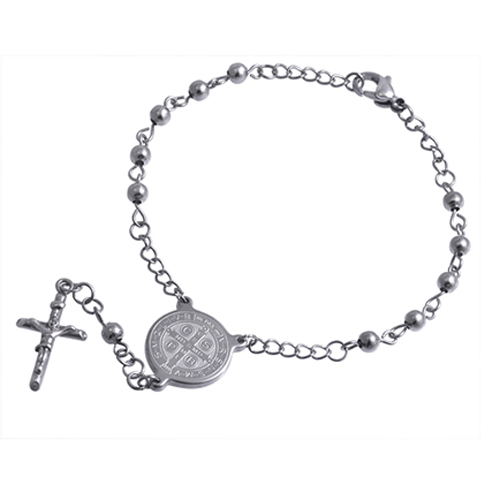 Stainless Steel Bracelet WITH 2 SETS OF 5 BEADS WITH SAN BENITO WITH CROSS WITH JESUS FIGURE ALL IN STEEL COLOR