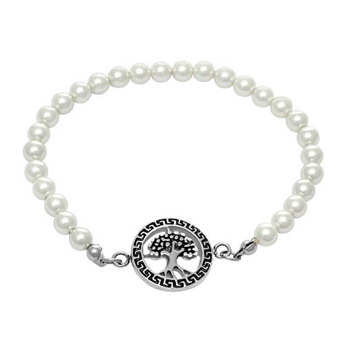 STAINLESS STEEL PEARL BRACELET WITH PEARL COLOR BEADS WITH STAINLESS STEEL TREE OF LIFE PENDANT IN IPG TWO TONE