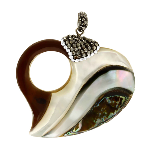 STAINLESS STEEL PENDANT OF SHELL IN HEART SHAPE WITH BLACK AND WHITE CRYSTAL AND BAIL IN S/S COLOR.