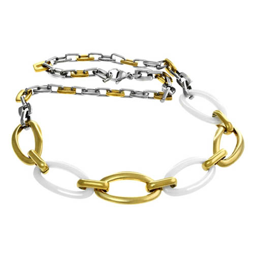 STAINLESS STEEL NECKLACE IN S/S & WHITE CERAMIC & IPG 3 TONES WITH OVAL RINGS
