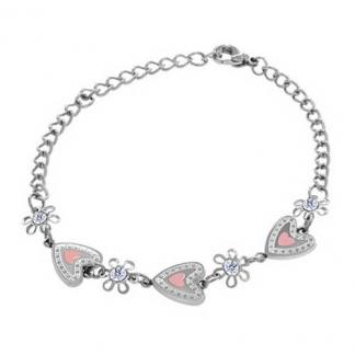 STAINLESS STEEL BRACELET WITH HEART PENDANT IN ENAMEL PINK WITH FLOWER PENDANT IN STEEL COLOR