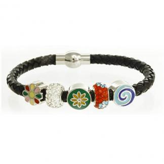 | STAINLESS STEEL BRACELET WITH LEATHER & MAGNET LOCK WITH 1 ENAMEL FLOWER BEAD WITH 2 ENAMEL ROUND BEAD WITH 2 ROUND CZ PENDANT |