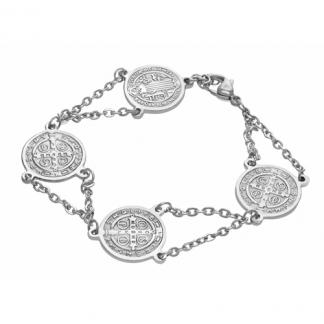 STAINLESS STEEL BRACELET WITH 4 SAN BENITO CHARMS LINKED WITH CHAINS WITH CLIP ALL IN S/S