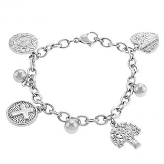STAINLESS STEEL BRACELET WITH 4 CHARMS IN DIFFERENT DESIGNS AND 3 STEEL BALL IN 8MM. THE HANGING CHARMS SIZES FROM 12MM-18MM WIDTH