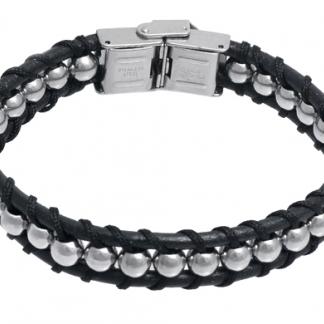 Stainless Steel Bracelet BLACK LEATHER BRACELET WITH BLACK COTTON STRING WITH STAINLESS STEEL BEADS