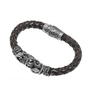 STAINLESS STEEL BRACELET WITH SKULL & SNAKE WITH BROWN LEATHER WITH MAGNET LOCK