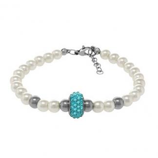 STAINLESS STEEL PEARL BRACELET WITH PEARL COLOR BEADS WITH 4 S/S BEADS WITH STAINLESS STEEL PENDANT IN CIRCLE SHAPE WITH CZ IN S/S COLOR