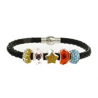 STAINLESS STEEL BRACELET WITH LEATHER & MAGNET LOCK WITH ENAMEL STAR BEAD WITH 2 ROUND CZ PENDANT WITH RED & PINK CRYSTAL |