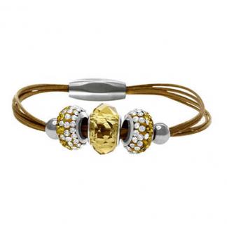 STAINLESS STEEL BRACELET WITH LIGHT BROWN LEATHER STRAND WITH S/S MAGNET LOCK WITH YELLOW CRYSTAL WITH 2 COLORFUL ROUND CZ PENDANT WITH 2 S/S BEADS