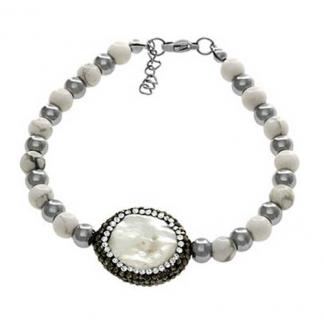 STAINLESS STEEL BRACELET WITH WHITE BEADS & S/S BEADS CHAIN WITH WHITE STONE AND CZ CHARMS