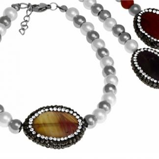 STAINLESS STEEL BRACELET WITH AMBER/BURN AMBER OR RED OR BROWN STONE AS CENTER PIECE WITH BLACK & WHITE CZ AROUND IT WITH PEARLS & S/S BEADS & SOME OTHER BEADS COMBINATION |
