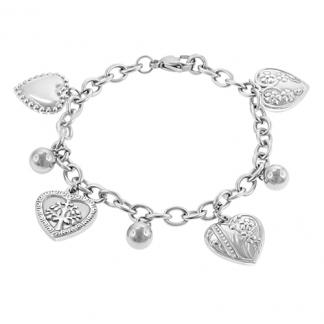 STAINLESS STEEL BRACELET WITH 4 CHARMS IN DIFFERENT DESIGNS AND 3 STEEL BALL IN 8MM. THE HANGING CHARMS SIZES FROM 12MM-18MM WIDTH