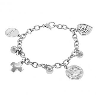 STAINLESS STEEL BRACELET WITH 4 CHARMS IN DIFFERENT DESIGNS AND 3 STEEL BALL IN 8MM. THE HANGING CHARMS SIZES FROM 12MM-18MM WIDTH