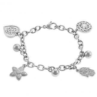 STAINLESS STEEL BRACELET WITH 4 CHARMS IN DIFFERENT DESIGNS AND 3 STEEL BALL IN 8MM. THE HANGING CHARMS SIZES FROM 12MM-18MM WIDTH